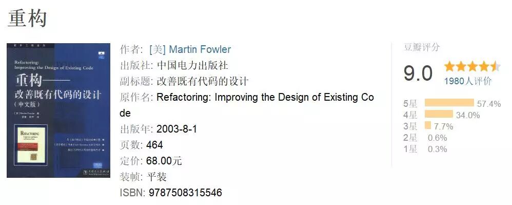 Martin Fowler写的《重构Refactoring》主要关于改进现有代码的设计。这是一个改变软件系统而不改变代码的外部行为,却能提高它内部结构的过程。