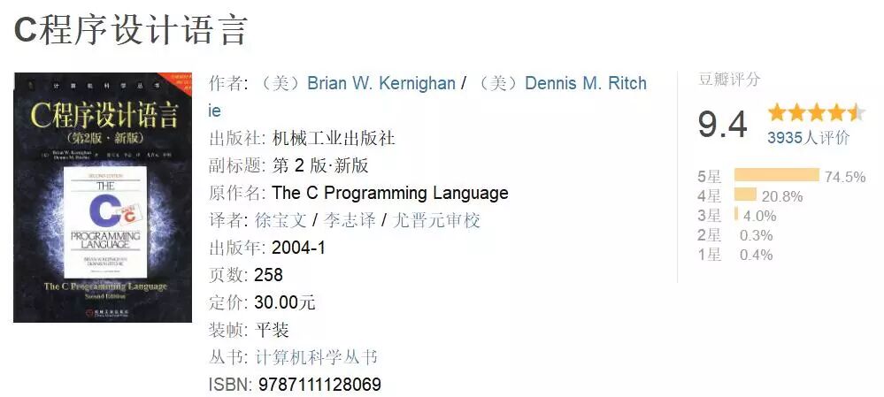 我们现在见到的大量论述C语言程序设计的教材和专著均以此书为蓝本。人们熟知的“hello,World"程序就是由本书首次引入的,现在,这一程序已经成为众多程序设计语言入门的第一课。对于计算机从业人员来说,《C程序设计语言》是一本必读的程序设计语 言方面的参考书。